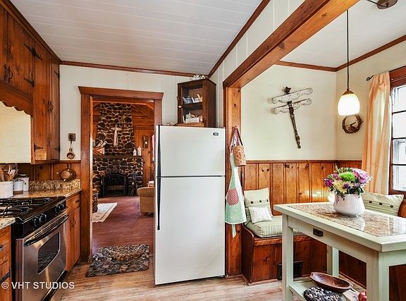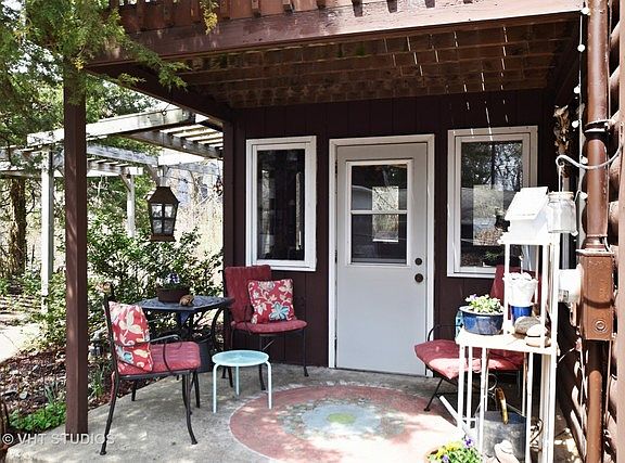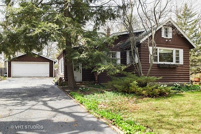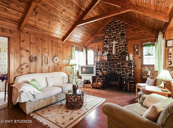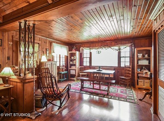 What's not to love about this woodland setting? So picturesque...2 story log home on 5 lots! Spacious living room with cathedral ceiling and soaring fieldstone fireplace plus separate dining room with wood planked ceiling. Kitchen with built-in seating nook, knotty pine cabinets plus appliances. Large porch/mudroom for convenient entrance. First floor master bedroom opens to lovely enclosed porch. Two bedrooms up with balcony overlooking welcoming views. Partial basement. Outside offers 2 car garage with workshop and shower. Garden with arbor and loads of perrenials and trees. Serene and inviting setting. Views in all directions!