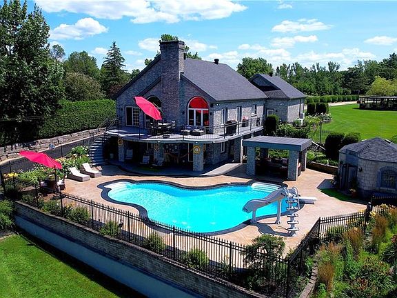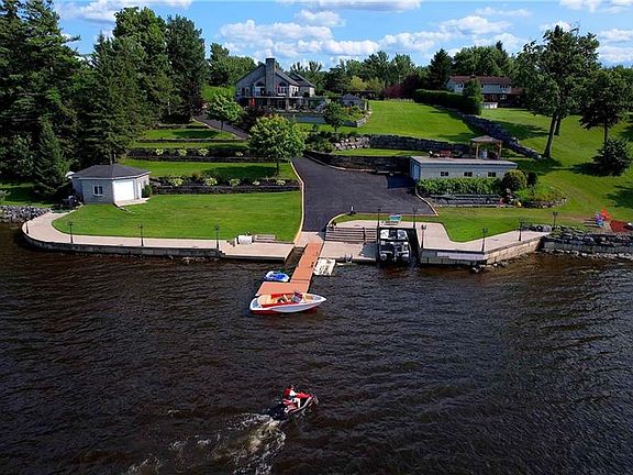 Experience unparalleled luxury in this spectacular resort-style waterfront home, perfectly situated on a sprawling 1.89 acres. This meticulous 4+ bedroom, 4-bathroom residence offers a dream lifestyle with lavish upgrades & custom-built features throughout. The open-concept design is enhanced by vaulted ceilings, a sleek kitchen & a stunning living/dining area. The walkout basement offers a versatile space leading to your outdoor paradise. Enjoy seamless indoor-outdoor living in the covered patios, ideal for entertaining or relaxing while taking in breathtaking sunsets. Step outside to your private outdoor haven showcasing a cozy firepit, a gazebo with a unique tree centerpiece & a serene fish pond, a lavish inground pool with marine lights, & pool house complete with its own bathroom. This property boasts ample garage space, a stunning dock & an impressive 218ft break wall. Offering the epitome of luxury, enjoy a dream lifestyle with every possible amenity at your fingertips.
