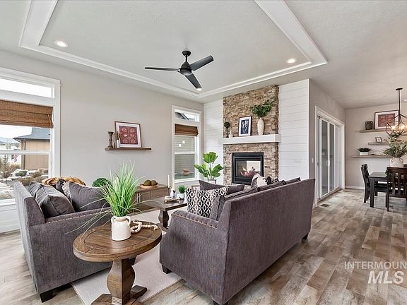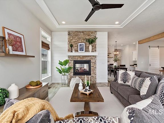 Desirable Hidden Springs community semi-custom with awesome views*Open floor plan showcases vaulted ceilings with exposed beams & abundant windows for lots of natural light*Spacious Gourmet kitchen boasts white painted cabinetry, Quartz countertops & glass block type backsplash, stainless "high end" appliances, oversized knotty alder island with farmhouse sink & elegant pendant lighting and don't miss the walk in pantry*Popular adjoining Living room features a unique 2 sided stacked rock fireplace that also leads to the covered patio for additional outside living space*Generously sized Primary Bedroom with a large walk in closet and a convenient outside access door*Designer colors & lots of shiplap and custom millwork trim throughout*Cartwright Ranch is like country living with the amenities of a master planned community that includes a community pool, walking trails and a few children playground parks*Just 15 mins to downtown Boise.