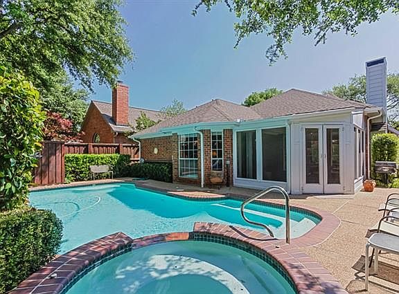 Inviting zero lot home in wonderful Addison with back yard oasis is a gem! The open formal living room & dining room are perfect for entertaining. Sweeping tranquil views of the pool and spa from the kitchen, family room, master suite, & screened in sun porch are peaceful. The master suite is spacious with sitting area, large walk in closet, and sizeable master bath. Architectural details include rounded archways, crown moldings, and marble fireplace. Exterior paint 2015. New pool pump motor in 2014. New pool plaster 2012. New interior paint in the last few years. New roof in 2011. Enjoy the Addison Athletic Center just a block away! Truly a find!