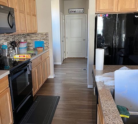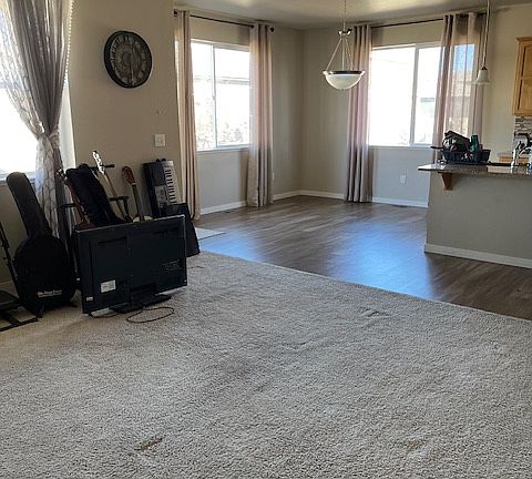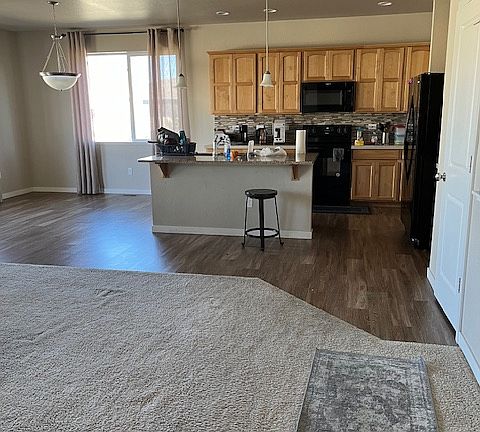 6 year old home in excellent condition, full unfinished basement. Harvest Village HOA with pool and HOA irrigation water provided. Low maintenance yard. Nice porch for relaxing. 3 car garage with openers. Includes refrigerator. Laundry hook-ups. Quiet neighborhood, low traffic. Green belt for walking is nearby, close to Rice Elementary school, and frisbee golf. Walking distance to Ridleys Grocery store and close to downtown Wellington. rental term is negotiable.