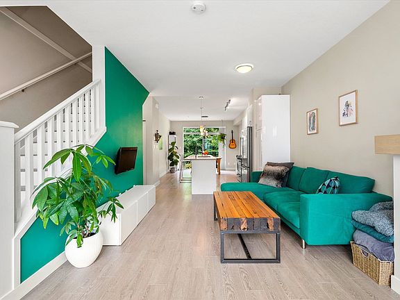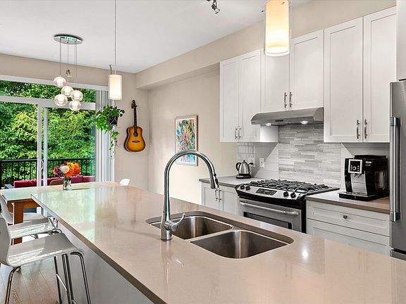 Stunning townhome located Downtown Squamish in the desirable Eaglewind, a stylishly modern home with large rooms and flexible open floor plan, lovely appliance package including gas stove and microwave built into the large kitchen island, pendant lighting and quartz counter-tops, large plank laminate floors, natural gas fireplace heats the entire home. With 3 bedrooms and 2 bathrooms above, as well as laundry. Enjoy your private treed views outback in your fence yard or mountain views from the front deck. This is home is perfect for Squamish living offering a huge garage with storage for all the toys, two cars, plus one full parking spot out front. Walk out your back door to all the estuary trails, tennis court, playground and a out the front to the shops, cafes and restaurants.