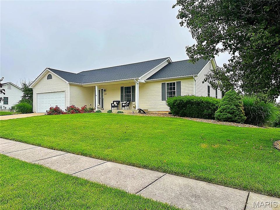 Prepare to be Blown Away!  This amazing Wentzville ranch home is nothing short of a Designer Showcase!!  As you enter the home the welcoming foyer, you see the beautiful wide plank AC4 Wear Layer Hybrid Flooring that is throughout the entire home! The Open floor plan leads you to the Cathedral ceiling Family Room with stunning custom molding throughout & wood burning fireplace, to the Dining area, then to the amazing kitchen featuring Granite counter tops, Breakfast bar, Stainless Steel Appliances, and Custom White cabinetry with puck lighting.  From the kitchen, you enter the Laundry mud room which leads to the oversized 2 car garage that will fit a full sized SUV.  Outside the dining area is a massive 22 X 14 custom deck with aluminum balusters & end caps with a staircase leading down to a nice covered concrete patio. To the living area is a very nicely updated guest bathroom, 2 nicely sized guest rooms, to the Master Suite with walk in closet, and bright Master Bath with Soaking tub, separate shower and vanity.  This amazing home sits on a nearly half acre lot with Landscaping to die for!  The Unfinished walk out lower level awaits you vision to make this home YOUR Paradise!