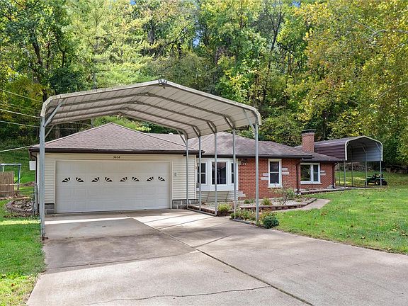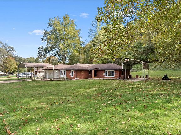 Picturesque and private lot! This brick ranch sits on 1.8 acres backing up to dense woods in a park-like setting. Inside you'll find a spacious living area with cozy wood-burning fireplace and two large picture windows that flood the area with natural light and provide great views of your lush back yard. Enjoy the fully equipped kitchen complete with breakfast nook and adjacent dining room with charming bay window. Down the hall are your 3 comfortable bedrooms including the primary suite with full bath, walk-in closet, and French doors opening to your private patio. Other features include beautiful 6-panel stained wood doors, attached 2-car garage, a 20x14 concrete pad with canopy in the side yard for your RV or boat, plus a backyard shed for additional storage. Located near highways 21 and 141 and just 10 minutes from Gravois Bluff shopping. Peaceful living with easy access to local amenities.