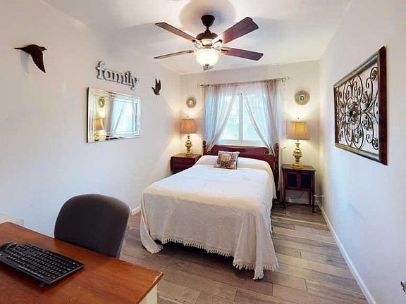 This 3-bedroom, 2-bath home is move-in ready, located near Gettysburg and Cedar and sits back from main streets in an established neighborhood. As you enter you will immediately notice the beautiful laminate plank flooring. This flooring runs throughout the living areas and bedrooms. In addition to the three bedrooms, there is a 4th room that could be used as a study/office/game-room or even another bedroom (with the addition of an armoire as there is no closet). The kitchen has tile floors, granite counters and plenty of cabinet space for your storage needs. It is open to the dining area, making for relaxed entertaining. The living area comes complete with a fireplace and slider to the backyard. The primary bedroom has an en-suite bath with shower and the second bath has a tub/shower combo, granite counters and custom backsplash. The well-landscaped backyard is a tranquil place to rest at the end of a long day. The sizable backyard space makes it easy to host large party events and there is a good-sized cement/brick area for outdoor furniture and a separate side yard that is gated with entry from the front. A very convenient feature is the 'smart watering' system that can be managed from your smart phone. Lastly, a 2-car garage finishes out this home and it is centrally located within walking distance from schools, parks, and more.