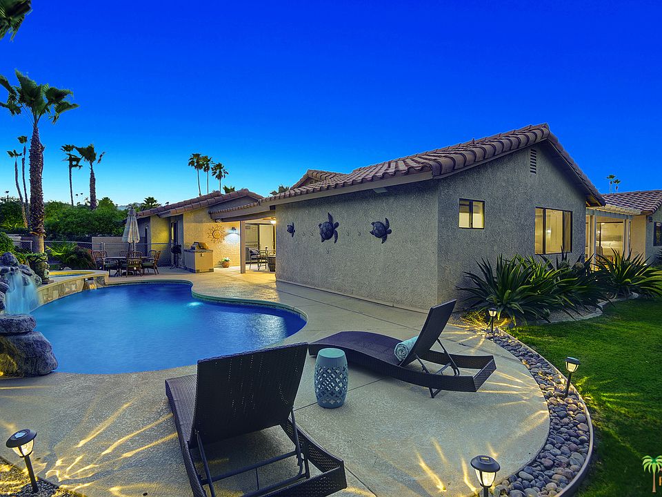 Rest and relaxation await you on the 2nd fairway of the private golf course within guard-gated Avondale Country Club. This 3BR 3 1/2BA home encompasses over 2,800 sq. ft. on a nearly 17,000 sq. ft. lot. Double entry doors welcome you into an over-sized great room with wet bar. The U-shaped floor plan allows for dual owner's suites on opposite sides of the home; both of which open onto a course-view patio. A spacious guest bedroom with great separation from other sleeping quarters offers beautiful western views. This home is truly designed around the indoor/outdoor living the Coachella Valley has become known around the world for. The incredible waterfall grotto pool has direct access to the kitchen, wet bar, and cabana bath..meaning entertaining is a breeze. There's also an enclosed dog run so your furry friends can join you outside while you soak up some sun. Whether you're looking for a full-time desert home, or a tranquil escape from the city, this home will be a sure delight.