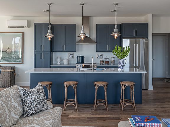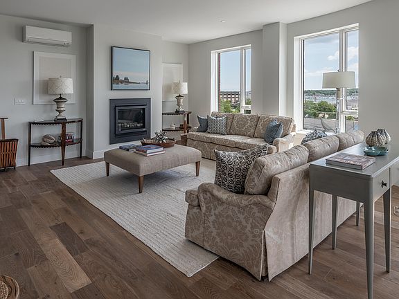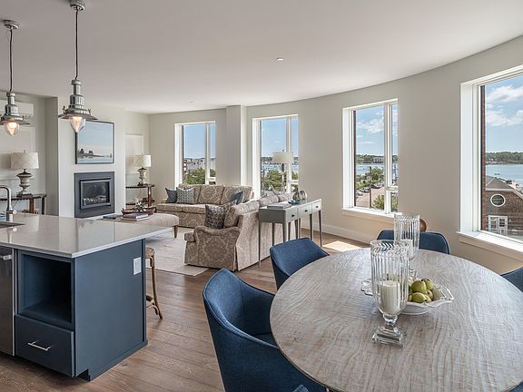 Welcome to Hobson's Landing, located on Commercial Street in Portland, Maine. This luxurious corner unit offers a large open floor plan featuring a sweeping curved wall of windows overlooking Casco Bay and the working waterfront. Unit 427 is located on the fourth floor in the newest phase of Hobson's Landing. Features include two bedrooms and two baths, gas fireplace, heat pumps for heating and cooling, 9' ceilings and hardwood floors. The primary suite offers floor to ceiling windows that provide stunning views of Portland Harbor, a large walk-in closet, and a luxurious bath with custom tile shower, radiant heated floor and double vanity. The second bedroom boasts large west facing windows and adjacent guest bath. Hobson's Landing is located in the heart of Portland's Old Port with easy access to great shops, marinas, theaters, museums, award winning restaurants and is in close proximity to Portland International Jetport. The building features top notch amenities including a clubroom used for private events and community gatherings and a guest suite that is available to house your guests in comfort. An on-site concierge available to help curate your day to day needs, fitness room, dog wash station, shared grill on one of the two common outdoors spaces, bikes and even a shared Tesla!