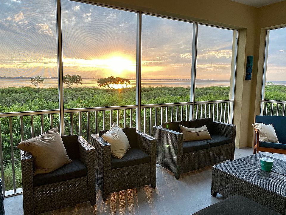 Commanding a panoramic sunset view over Anna Maria Sound towards Tampa Bay where the sparkling waters join in their flow to meet the Gulf of Mexico, this home delivers the quintessential experiences of Florida's nature and luxury. Located in the North corner of its well-placed building, the lucky owners enjoy these spectacular Northwesterly views on the spacious lanai without obstruction from the neighbor building. Second floor living delivers the elevation for those commanding views and the convenience of one flight of stairs for a quick trip down if the elevator is not preferred. Inside also sparkles - with a wall of sliders lighting the open concept great room and gourmet kitchen. Throughout the home are designer finishes that make living grand such as Cambria Quartz countertops in the kitchen and all three bathrooms, all new high end lighting fixtures, all new Fanimation ceiling fans with super quiet motors and lifetime warranties, Hunter Douglas automatic blinds with remote control in the great room and master bedroom, and custom paint in soft hues throughout will delight and soothe the soul. In this gated private island paradise community, residents enjoy a private beach club with an amazing restaurant, poolside service and Sky Bar, and a private sandy beach with hammocks, palm trees on the Sound. Get your workout done in the well-equipped fitness center also overlooking Anna Maria Sound. Explore the waters in the kayaks provided or home your own boat at the marina, open to the public, just steps outside the gates. And if you prefer having a fleet of boats to choose for your water adventures, join Freedom Boat Club, also steps from your door. Although you may not ever want to leave the private island community, Anna Maria Island is just a mile away with wonderful restaurants, shopping, music and art venues, and of course the world famous sugar sand beaches. Sarasota and Tampa both provide innumerable exciting opportunities for exploration. When you return home, you will feel the joy and comfort of watching the iconic Florida sunsets from your own home, whether permanent or second home vacation retreat. Also perfect as an investment property. Make your appointment to visit, and as soon as you experience the beauty, luxury and views for yourself, you will know this is the one.