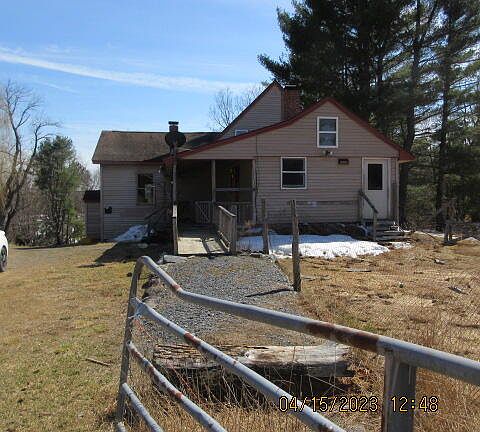 Cozy,3 bedroom,1.5 bath on 6.39 Surveyed acres overlooking beautiful Monson Pond, with a front porch with Monson Slate steps and wall. 1 car garage, Large barn and out building, fence. Exposed beams in the kitchen. Sold As is