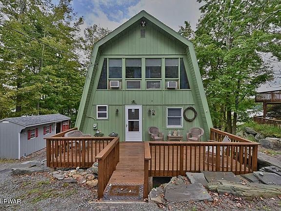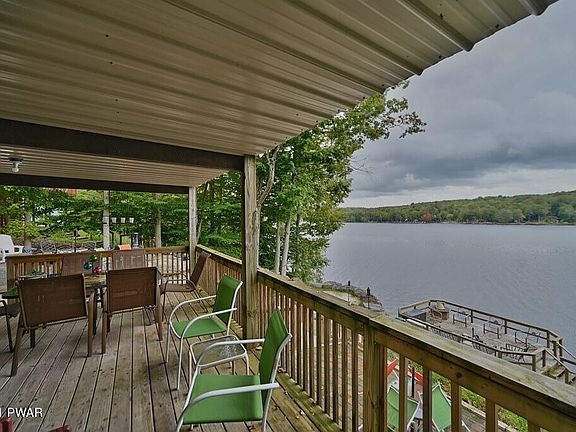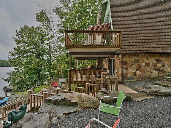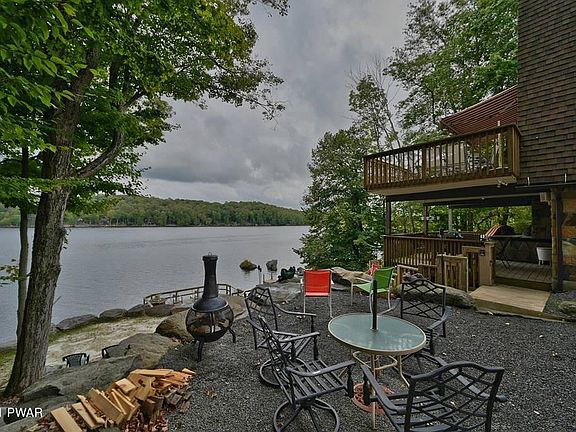 POWERBOATING LAKEFRONT HOME ON ROAMINGWOOD LAKE in The Hideout, a four season amenity filled community in The Northern Poconos, just two hours from the NYC and Philadelphia areas. This home has AMAZING VIEWS and lake frontage for the ultimate lake experience, including a sandy beach area, gravel firepit area, two tiered deck area by the dock, a patio, upper and lower deck area. The home is the perfect combination of a mountain lake home with modern touches. Beautiful new kitchen chef's kitchen with pot filled, double oven, stainless steel appliances, granite counter tops. hardwood flooring and knotty pine throughout, two stone fireplaces. A full finished walkout lower level with 2nd kitchen, bathroom and bedroom for guests. Check the pictures for more details.