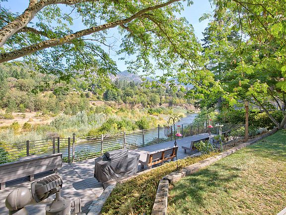Beautiful river views! Enough decking to entertain the whole neighborhood with lots of built in seating. Covered breeze way allows for outdoor entertaining on rainy days. Storage abounds 24'x32' barn, large shop within the two-car garage has 220 power, 34'x54' drive- in RV Parking or store your treasures in this temperature controlled metal building with concrete foundation. This was the home of a gardener so lovely flowering gardens, fruit trees and established garden area will delight those with a green thumb!