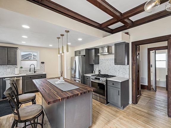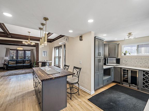 Step inside to discover stunning natural woodwork throughout, complemented by gleaming hardwood floors that add warmth and character to every room. The newly renovated kitchen is sure to impress, featuring sleek new countertops, custom cabinetry, a spacious center island, a wine fridge, and a dedicated coffee bar making it the ideal space for both cooking and entertaining.