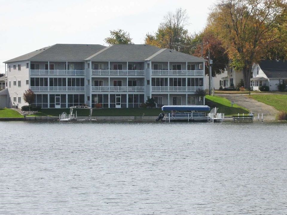 Awesome east corner unit with incredible panoramic lake views. This lakefront condo has been very well maintained and looks like new. Great open floor plan with a split bedroom layout. Custom kitchen with top of the line appliances, lots of storage and an abundance of counter space. This is a 3 bedroom 2 bath condo with 1,428 finished sq ft of living area. What a great opportunity to be on a ski lake without paying the "Big" bucks, but still having a very nice residence to live and entertain in. This also comes with a oversized 1 car detached garage directly out the front door of the unit. No steps are involved with this unit.....its all on one level right from the parking lot or garage. Truly a great investment with possession the day of closing.