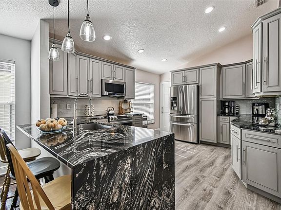 Welcome to a home where luxury meets ease… and where every day feels like a getaway. Located in the highly sought-after guard-gated 55+ community of Kings Ridge, this completely updated residence invites you to live the Florida lifestyle you’ve always imagined. Step inside and feel instantly at home. The gourmet-inspired kitchen is a showstopper, perfect for the cook who loves to create, entertain, and savor. Featuring custom cabinetry, granite countertops, stainless steel appliances, a stylish tiled backsplash, and beautiful flooring, it's the heart of the home and ready for your favorite recipes. The updates continue throughout, with stone countertops, glass bowl sinks and brand-new vanities in each upgraded bathrooms. A perfect blend of comfort and sophistication. You’ll love spending time in the oversized family room, where high vaulted ceilings and warm wood flooring set the stage for cozy nights in, family gatherings, or quiet mornings with your coffee. In addition to the two bedrooms, there is a third flex-room, perfect for an office, den or visiting guests. Looking for flexibility? The enclosed covered lanai, with its lovely tile and windows, offers a versatile bonus space perfect for a craft room, reading room, or playroom for visiting grandkids. And when you’re ready to enjoy that Florida sunshine, step out to the expansive screened-in back patio, a peaceful spot for lounging, dining, or simply taking in the breeze. But the lifestyle here extends far beyond your front door. At Kings Ridge, every day feels like a resort vacation including championship golf courses, tennis & pickleball courts, sauna, fitness center, clubhouse with endless activities, plus, a guarded gate that offers peace of mind and security. And the best part? Your HOA fee covers it all: lawn care, internet, cable, phone service, irrigation water, and even exterior house painting every five to seven years. Live more, stress less. If you’re looking for a home that delivers comfort, style, security, and the true Florida lifestyle, this is the one you’ve been waiting for. Come see your next home. Your best chapter starts here!