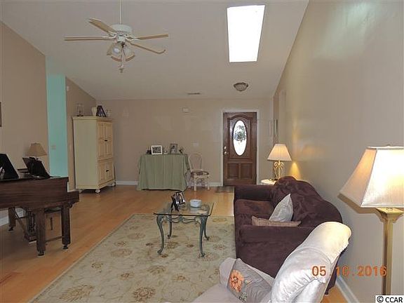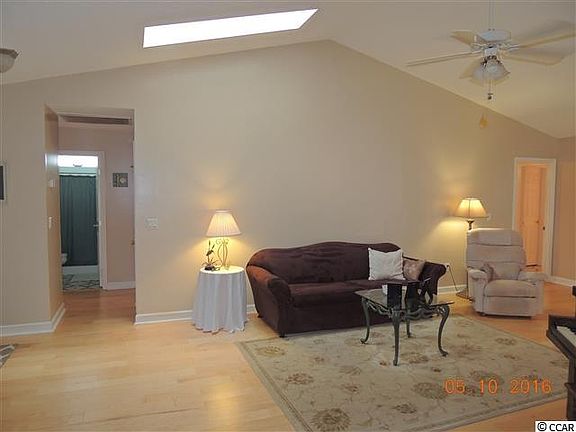 FOR THOSE WHO WANT TO ENJOY MORE ENTERTAINING and LESS MAINTAINING! Spacious 3 bedroom. 2 bath home in a small, quiet subdivision in Little River, without any HOA fees! This brick front home, with vinyl siding is low maintenance and sits on a large lot just under ½ acre. Beautiful concrete stamped driveway, along with sliding screens for the 2 car garage. 6 beautiful mature palm trees adorn the property and supplied with lawn irrigation in front and sides. The living room/great room is large with vaulted ceilings and a skylight. All new hardwood flooring throughout the entire house, with the exception of tile in the bathrooms and kitchen. There is a galley-style kitchen, with large pantry closet, plenty of cabinets with all appliances: refrigerator, dishwasher, microwave, garbage disposal and new stove/range. The dining area is both shared with the large great room and kitchen. All bedrooms and great room are equipped with ceiling fans. The master bath has a large shower, and comes with a full size hot tub. The large 16x26 three season room for relaxing is sun-sational! French doors lead out to the large picket fenced back yard that was designed for plenty of fun with the family and friends. Extremely low maintenance of the yard means more time for enjoyment with endless possibilities, i.e. pool, horseshoes, volleyball, outdoor kitchen/grilling. Have a green thumb? Plenty of planting space ready for your home grown fruits and vegetable. The small shed also conveys. All this located in the heart of Little River, not far from the waterfront, home of the famous Little River Blue Crab Festival, plenty of restaurants and close to shopping and golfing. Only a few miles to the beautiful beaches of the Atlantic Ocean!