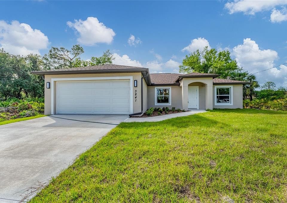 One or more pictures have been virtually staged. COMPLETED AND READY FOR OCCUPANCY. Welcome to this new and beautifully constructed 3 bedrooms + ENCLOSED OFFICE (11x13) with spotlights, 2 bathrooms home with a 2-car garage. It is located in the fast-growing city of North Port. This property features ceramic tile floors throughout the house for easy maintenance, impact windows and impact sliding doors, which do not need hurricane shutters. The living area is expansive and has large sliding glass doors, which open up to the porch. The tiled lanai is under one roof with the house. The kitchen has quartz counter tops. It also features 39'' inches soft closing cabinets, upgraded stainless steel appliances, and a kitchen island overlooking the living and dining/breakfast areas. The master bedroom has a walk-in closet and sliding doors that lead to the lanai. The master bathroom has a linen closet, walk-in shower with a built-in bench and a double sink. Both - the master and guest bathrooms have full-length tiled shower walls. There is also a linen closet in the hall (between two guest bedrooms), and an inside laundry room with a sink. Other features of this home include seamless gutters around the entire house, quartz windowsills. There is plenty of room for a pool.