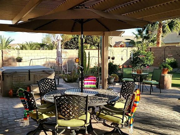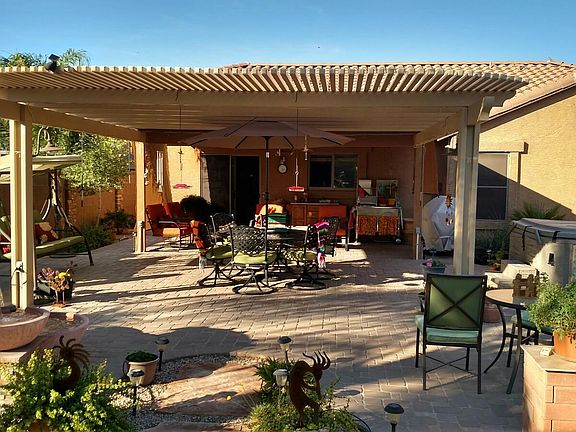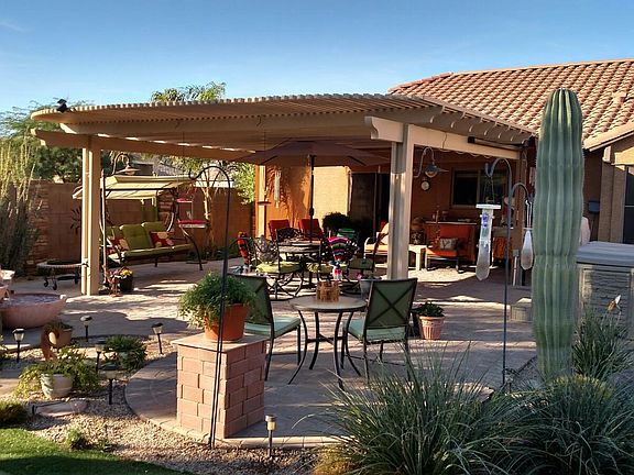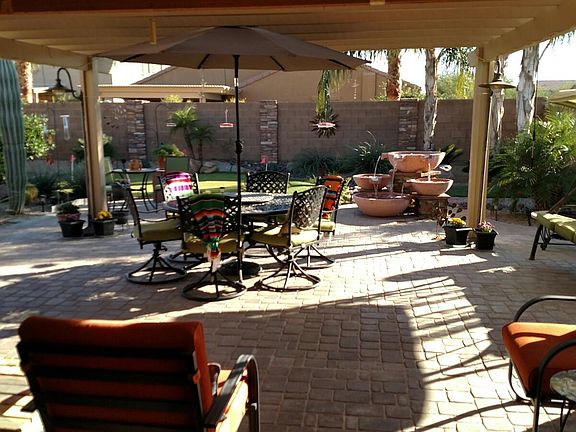 2 bedrooms, open library that flows into front room and kitchen. Very large master bedroom and bathroom suite with large walk in closet. Large laundry room. Home flows through to a beautiful landscaped back yard with 1000 sq ft pavers,covered patio, putting green and desert landscaping with mature plants, Queen palm trees and three citrus fruit trees, mist sysyem, large fountain and garden, front and back yard on irrigation system. Electric and gas appliances. Corner premium lot. Back yard South exposure great for winter, front faces North. Garage has custom built-in cabinets and storage. Kitchen has island, granite countertops, pantry and custom built slide trays in all lower cabinets. Upgraded fans in all rooms. Sun screens on all windows. Great snow bird home or retirement. Easy to maintain. New carpet Nov 2020. New AC/Heater 2021. Large laundry room new W/D 2021.
