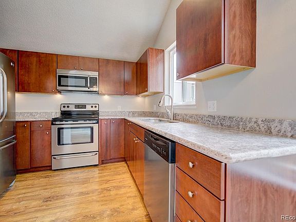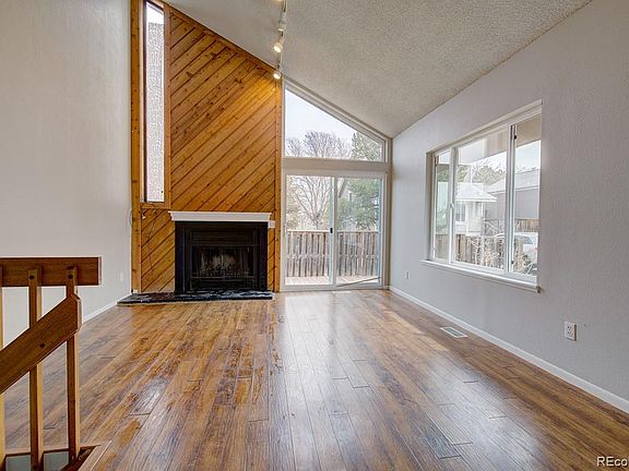 This Aurora home offers a wood burning fireplace, granite kitchen countertops, stainless steel appliances, a vaulted living room ceiling, and an open patio.