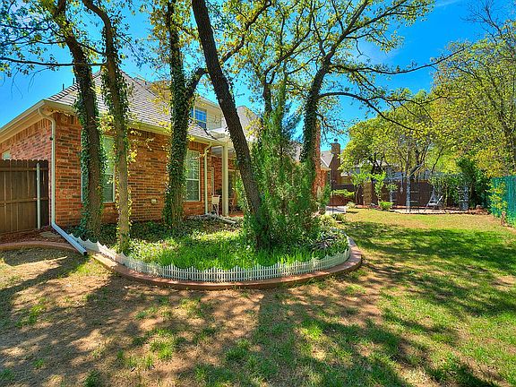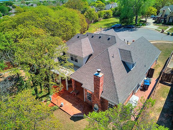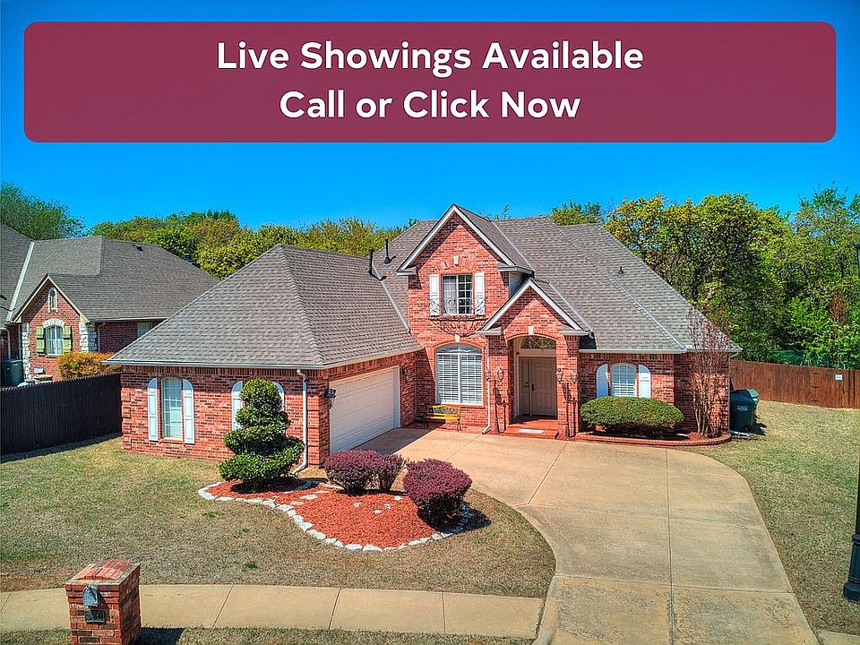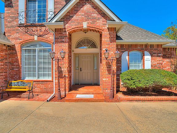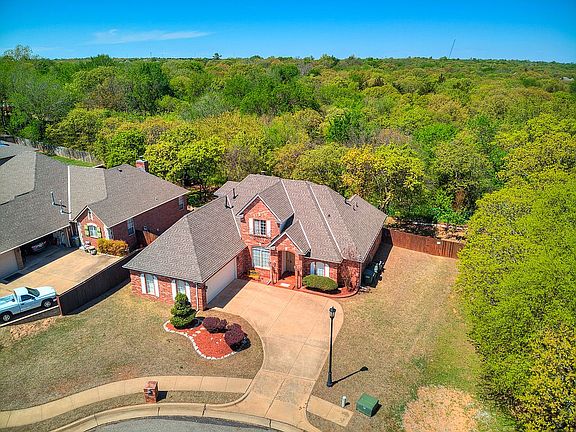 Wonderful EAST EDMOND HOME - only .25 mi to I-35! Classic Red Brick design with stately curb appeal. SURROUNDED BY OPEN SPACE & PRIVACY - it backs to private acreage for beautiful wooded views from the back patio. Plus, it sets in a culdesac with an empty lot to the side and a green space across the street (see aerial image). Garage has double door, but is actually 3 car size (30 x 22) so there is plenty of room for storage or workshop - also the SIDE LOAD garage offers more driveway space and makes the front of the home more attractive. Elegant main gallery with formal living & formal dining - each space accented with crown molding and impressive plantation shutters. Exceptional bed/bath ratio with Guest bath, en suite bath for Bedroom 2, and Hall Bathroom upstairs. The kitchen features oak cabinetry and generous countertop space with a breakfast bar overlooking the living room. There is a bright & cheery plant ledge along the dinette window. Check out the video or call for a SHOWING!