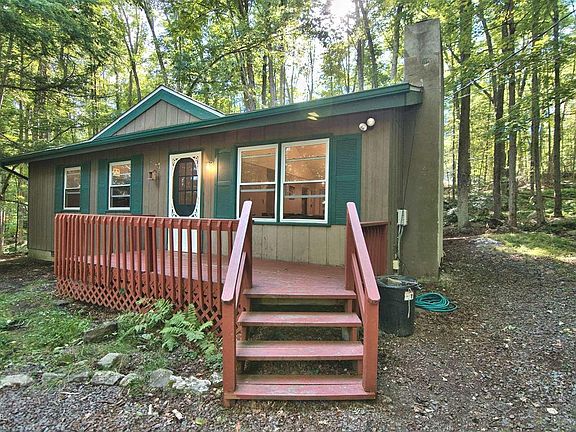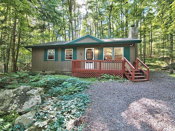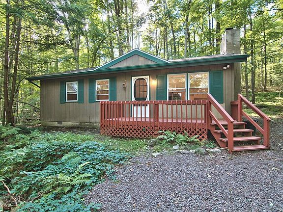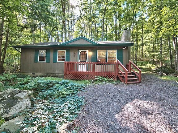 Tucked in the woods at the end of a private cul-de-sac in a four season amenity filled community in The Northern Poconos. This 3 bedroom ranch home has an open living area with vaulted ceilings, a brick fireplace and access to the screened in porch. Everything is on one level! The location at the end of a cul-de-sac and the wooded lot make this a private getaway. The amenities include lakes, beaches, pools, clubhouse with restaurant and pub, golf course, ski hill, tennis, indoor recreation complex with tennis/fitness center/arcade and more, basketball courts, ball fields, children's playground, miniature golf, walking trails, arts and crafts, a great recreation program including day camp for kids, campground, 24 hour security, gated access.