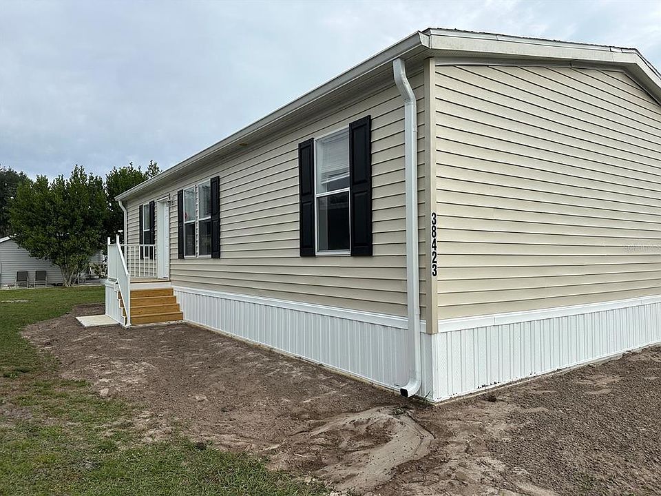 This 3 bedroom 2 bath home is a rare find.The double wide is a Palm Harbor Keystone Mesa boasting 1172 square feet of living space. The split floor plan has new laminate floors throught the main living space, tile in wet areas, neutral interior paint, new exterior sighting, and a temite-proof storage shed along with a beautiful aluminum carport are both attached. Find yourself at home in this quiet and affordable 55+ community of Shady Oaks. Golf carts and pets welcome. Convient location just off 301 and 39. Schedule your showing today!