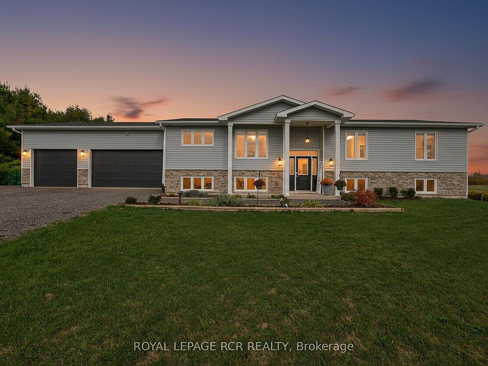 Welcome to this charming and thoughtfully designed raised bungalow featuring 3+1 bedrooms and 3 bathrooms in an ideal location on two paved roads, just minutes from town. Step into the inviting open-concept main floor, where the kitchen boasts durable vinyl flooring, sleek subway tile backsplash, a convenient pantry, and a modern hood range. The spacious living room offers luxury vinyl flooring, a cozy propane fireplace with a contemporary mantel, and a walk-out to a stunning 23' x 16' cedar deck, perfect for entertaining or relaxing outdoors. The dining area continues the open-concept flow, with large windows that flood the space with natural light. The primary bedroom features broadloom carpeting, a generous walk-in closet, and a private 3-piece ensuite complete with vinyl flooring and a luxurious rain shower. Two additional main floor bedrooms also feature soft broadloom and ample closet space. A stylish 4-piece main bathroom includes a relaxing soaker tub and a bright window for natural light. A laundry room can be found on the main floor with a convenient walkout to the 3 car garage. Downstairs, you'll find an ample finished space, designed to be a potential inlaw suite (wiring, plumbing installed, appliances already in), with a recreation room and fourth bedroom featuring laminate flooring, a closet, and deep windows for plenty of natural light. Additional features include pot lights, a rough-in for a potential kitchen, a rough-in in the furnace room for a 2nd laundry area, GenerLink system, humidifier, and sump pump for added convenience. Walkup from the basement to garage. This home blends comfort and modern design in a family-friendly layout. Approx 2551 finished sq feet.
