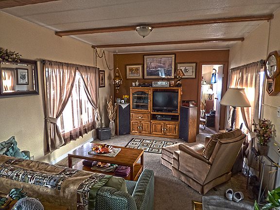 Charming home with spectacular views! Beautiful home with so much to offer! The entry takes you into the spacious open floor plan. The kitchen has lovely wood floors and charming white cabinetry with new appliances. The master is located at the back and offers space saving built in dresser and cabinet. Everything is in excellent condition and the home as been well cared for. The walls are sheet rocked, textured and nicely painted. Vinyl frame, double pane windows throughout. The living room has beamed ceilings. Enjoy amazing expansive views of the mountains and the Reno skyline from your private covered patio. The nice size back yard is fenced. Storage shed and side by side parking. A real must see home! Lot Rent: 633/mo | Includes: None