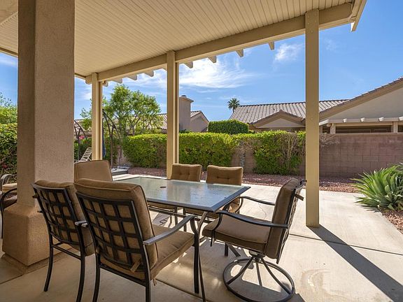 Sun City Palm Desert - Emerald. Located a short distance to the Mountain View Clubhouse, this estate model home has a spacious rear yard with an expansive patio, alumawood patio cover and peekaboo mountain views. A gated front courtyard and double door entry provide curb appeal. Inside, tile flooring is throughout. 12ft coffered ceilings are in the greatroom and foyer (with up-lighting). 10ft ceilings are elsewhere. The kitchen features double wall-ovens, a chef's island w/vegetable sink and breakfast bar, and a skylight. A custom buil- in media center with wet bar is in the family room. The primary suite has a bay window and a large walk-in closet with mirrored doors. The primary suite bathroom has dual sinks, a stall shower w/textured glass doors and an oversized tub; tile surfaces. A shower/tub is in one guest suite bathroom. A stall shower is in the other guest suite bathroom. The laundry room has extensive cabinetry and utility sink. The 2+ golf cart garage has room for ample storage and an evaporative cooler.