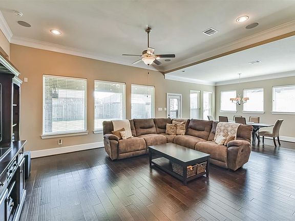 Welcome to this beautiful David Weekly Home located in the master planned community of The Falls at Imperial Oaks. This 1-Story home truly has it all from a phenomenal layout that completely embodies the open concept while including 4 bedrooms, 3 full bathrooms, a formal study and a mother-in-law suite with a split floor plan. You will enjoy all the extra finishes in this home from the crown molding, spectacular 3-car garage with epoxy floors, new interior hardwood floors, largely functional kitchen and a one of a kind covered patio with an outdoor fireplace. This home is equipped with 10ft ceilings for a bigger feel and that feeling is prominent, in ground water sprinkler system, an abundance of attic space, backyard shed, all stainless steel appliances, and last but not least an oversized primary shower with an overhead water fall shower and dual shower heads. The neighborhood provides multiple pools, dog park, fitness center, clubhouse, lake access, running trails and much more!