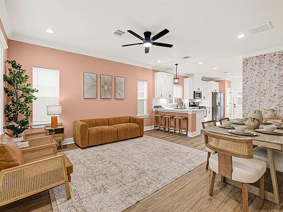 Welcome to this three-bedroom, two-bath, two-story home offering a comfortable and functional layout. Upon entry, you’re greeted by an open-concept living, kitchen, and dining area, creating a seamless flow for everyday living. The spacious living room connects effortlessly to the kitchen, which features ample cabinetry and a convenient breakfast bar. The primary bedroom provides a relaxing retreat with an ensuite bath featuring dual sinks and a tub-and-shower combo. Two additional bedrooms are generously sized and share a full bath with a standing shower. Additional highlights include an in-home laundry area and access to a spacious, shared, fully fenced backyard with a patio, perfect for outdoor enjoyment.