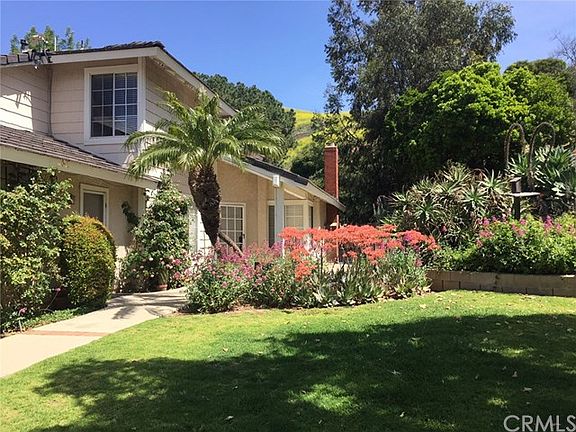Unique location, offering privacy and seclusion, on this approximately 19,000 square foot lot with a long drive way to the home. Largest model in the Country homes with 3 bedrooms and 2 3/4 baths. Kitchen has an island, large pantry and overlooks the dining area with sliders out to covered patio and backyard. Living Room has stone fireplace and also provides a slider out to the patio and backyard. The third bedroom is on the main floor along with the 3/4th bath which has an oversized shower. The master bedroom is upstairs and offers a view of the backyard and the hills. It has a dual sink bathroom and 2 closets with mirrored doors. The second bedroom upstairs also works as a master bedroom as it has it's own full bath. There is a two car garage with garage door opener. The large yard provides a combination of hill and flat area. There are large trees, bushes and shrubbery on the hills and grass on the flat area. Home is located in the new Yorba Linda High School District.