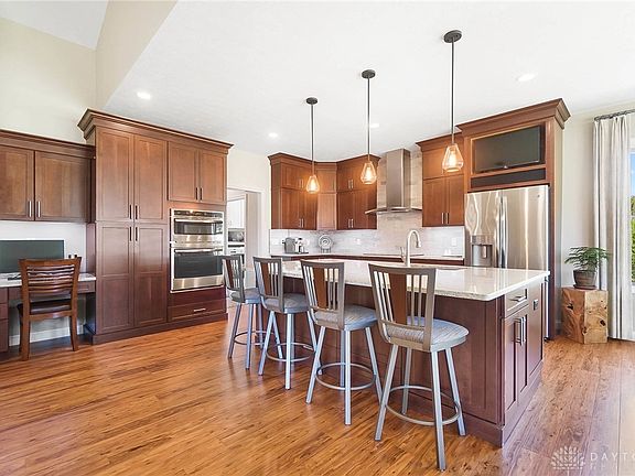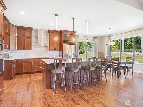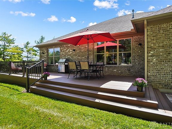 Stunning Custom Ranch with Finished Basement in Bellbrook, Ohio. Discover luxury living in this like-new, immaculately maintained custom ranch nestled on an elevated lot with no rear neighbors, offering ultimate privacy and serene wooded rear views. The stone and brick exterior exudes timeless charm complemented by a welcoming covered front porch. Step inside to elegant Eucalyptus hardwood flooring throughout the main level, blending beauty and easy maintenance. The spacious great room impresses w/ a cathedral ceiling, cozy corner fireplace & oversized Anderson windows that flood the space with natural light and offer picturesque views of the backyard. The gourmet kitchen is a chef’s dream, featuring custom cabinetry extending to the ceiling, granite countertops, large eat-in island and stainless steel appliances which include a refrigerator, dishwasher, cooktop, wall oven and convection microwave. The adjacent dining area, surrounded by windows, offers direct access to a large composite deck with aluminum railing—perfect for outdoor entertaining. The luxurious primary suite includes a spa-like en suite bathroom with a granite countertop, dual sinks, a custom-tiled shower & a large walk-in closet w/ composite wood shelving. A second bedroom, full bath, laundry room & mudroom complete the main level. Finished lower level boasts a bright rec room w/ large daylight windows, a 3rd bedroom w/ egress window, a full bath & a versatile exercise room, with egress window, that could easily be converted into a 4th bedroom. Additionally, there's ample storage space in the unfinished area that has a painted concrete floor. Side-entry, 2-car garage features epoxy type flooring & built-in cabinets (room to add a third-car detached garage bay off the end of the driveway, if desired). Professionally landscaped yard includes a full irrigation system & a paver walkway that leads to the composite deck. This Bellbrook gem truly shows like-new & offers impeccable quality plus luxury!