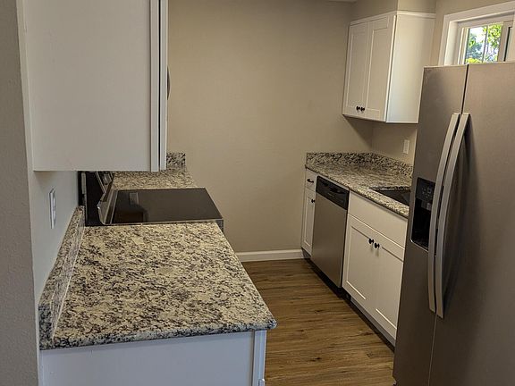 Nestled at the end of a tranquil dead-end street, this beautiful home offers a perfect blend of modern amenities and serene living offering an efficient gas forced air heater (installed in 2022) and Sleek kitchen cabinets with granite countertops. The home has undergone a comprehensive remodel with recent upgrades that include new vinyl plank flooring, plush carpet in the bedrooms, updated baseboards, trim, including most of the doors. This home also offers modern electrical fixtures, plugs, and switches and a freshly painted interior and exterior. You'll enjoy the stylish new vanities, shower/tubs, sinks, and faucets, and a durable 35-year roof.