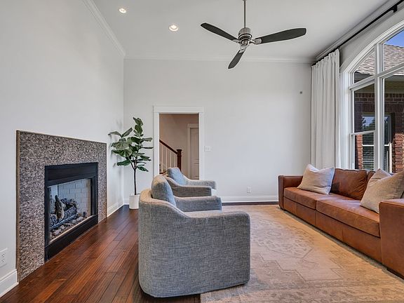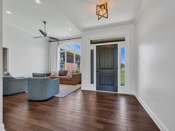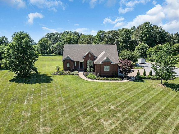 Gorgeous all-brick home on 5 sprawling acres that backs up to picturesque farmland. Custom-built home with well-appointed kitchen featuring Hickory cabinets and granite counters with tile backsplash and stainless appliances that includes a gas range. 11-foot ceiling and gas log fireplace in the Living Room, 12-foot tray ceiling in Primary Bedroom & Bath, and 9-foot ceilings throughout the main level. Huge shower with dual shower heads in the Primary Bath, custom wood trim and hardwood floors throughout the main level, central audio for Kitchen and Covered Patio, fabulous Media Room with seating and all equipment to remain. Plumbing and electrical roughed in for a full bath off of Media/Theater Room, all utilities roughed in for a 45'x 60' detached shop with a full bath, 2x200Amp electric service, tons of walk-in floored attic storage with R-50 insulation, tankless water heater, 6x14 solid concrete storm shelter, and there is room for a pool without disturbing the septic lines!