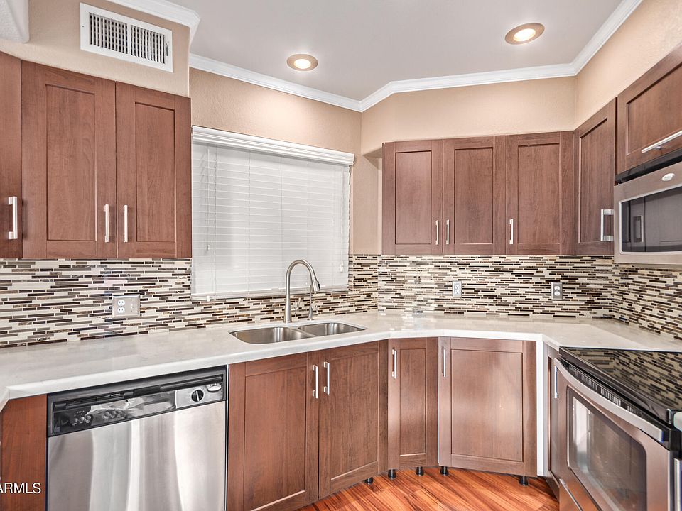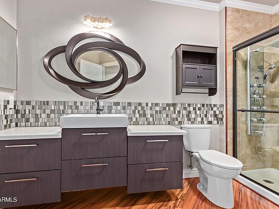 This beautifully remodeled condo is in the gated community of Hawthorne Condominiums. The unit features a split-floorplan layout, with upgraded wood laminate flooring throughout, two-tone neutral paint, crown moldings and ceiling fans in every room. The kitchen is truly stunning, boasting Quartz countertops, a tile backsplash, a breakfast bar, upgraded cabinets, and stainless-steel appliances. The primary suite is spacious, offering a large walk-in closet and a separate private bathroom. The complex provides an onsite fitness center, a clubhouse, 2 large pools, and hot tubs for residents to enjoy. Additionally, the location is ideal, being just minutes away from some of the finest eateries and bars in Central Phoenix. It is also conveniently close to downtown Phoenix and the light rail.
