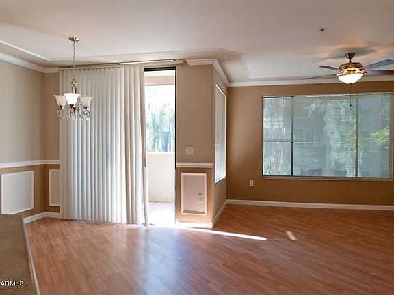 This one really feels like a home. Recessed lighting in the kitchen provides more light than other units may have.Few tones of light beige paint, custom made crown molding in the livingroom and dining area warm up the space making it more elegant. Laminate flooring in the living room, carpet in bedrooms. The community has two pools and spas, pool ramadas, 24 h fully equipped exercise studio.Great central location. Condo is far enough form a busy street but the community is in a walking distance to a lightrail station, Indian Steel Park that features lakes, lots of grass area to play, picnic area, fountains, monuments and historic buildings.