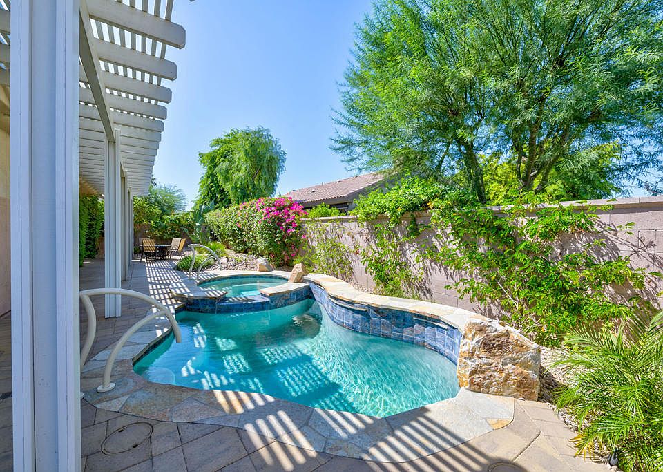 55+ Sun City Palm Desert--The ''Best Bang for your Buck'' active retirement community in the Coachella Valley! Located on a fabulous corner lot and close to the main Mountain View Clubhouse. Fostoria model (pre-Morocco model) with 3 beds./3 baths, den, detached casita and newer sparkling pebble tech POOL and SPA. Nice curb appeal with custom stacked stone facade, private gated cozy courtyard w/seating area perfect for your morning coffee, alumawood awning between the casita and house. Newer Milgard windows/doors, wood-look tile flooring. Inside, bright and open floor plan, high ceilings, transom windows, tile trimmed fireplace, spacious den with built-in bookcases and desk, living room and dining area open to the kitchen and patio views. Beautifully upgraded kitchen with granite countertops, and breakfast nook, chef's island and skylight, upgraded cabinetry. Double doors lead to the master suite and has an amazing view to the pool and patio, bathroom has dual vanity bath and soaking tub, stall shower and large walk-in closet. Guest bedroom has bathoom access in the hallway. Detached casita with access from the courtyard, French doors and stall shower in the bath. Indoor laundry area includes washer and dryer. The garage has built-in storage. The rear patio is extended and covered with alumawood awning, custom concrete overlay, stunning custom pool/spa, BBQ and firepit.This home is perfect for both relaxing and entertaining! ''Buy where you love to play,Sun City Palm Desert!'