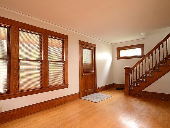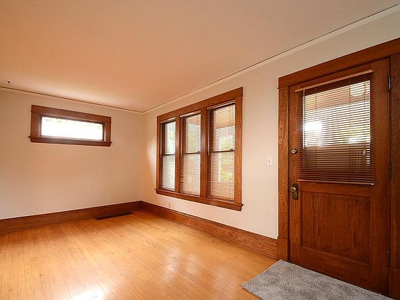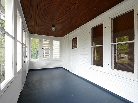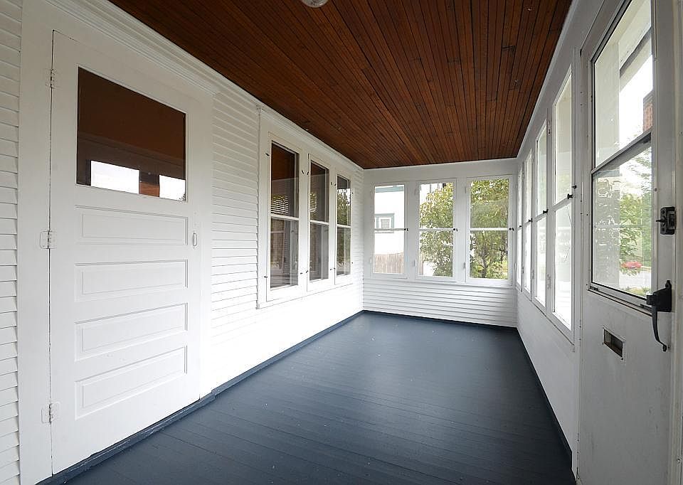 cLight and airy with wonderful woodwork with built in buffet and hard wood floors and stained glass. Great character! Fresh paint and new carpet on stairs and den. 2 large bedrooms and den/office/nursery off of one. Good sized kitchen with a plenty of counter space. Big 3 season porch. Yard is fenced with play house. Newly painted and sealed basement.