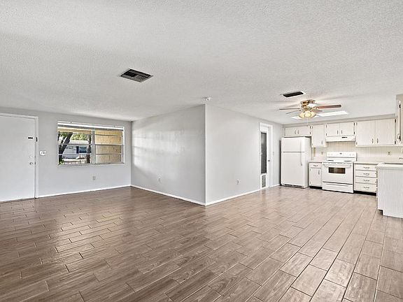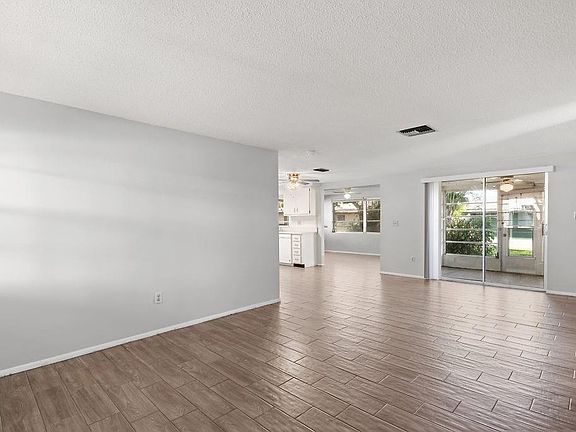 Take a look at this desirable home! The home features an open floor plan with lots of natural light. Recently updated flooring features the durability of tile and the look of rich wood! This home has the rarely found lush landscaping surrounding the large covered front patio. The oversized garage has plenty of room for storage. The rear screen patio opens to the living room with sliding doors and is the perfect place to relax! The home has two spacious bedrooms and two bathrooms. There is an optional community center with a pool nearby as well as being close to shopping and numerous restaurants. Hurry to see this great value and move in ready home!