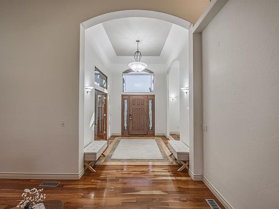 Prepare to be dazzled by this immaculately maintained home in the Cobble Creek Golf Community. Mature trees and professional landscaping invite you to step through the arched entry to a double-height foyer and views of the lush backyard and golf green. Glass French doors open to the cozy den, with window seat and plantation shutters. A formal dining room connects to the kitchen equipped with cherry cabinets, granite counters, LG smart appliances, bar seating, walk-in pantry, and bay-window breakfast nook. The open concept living room is a true centerpiece, boasting soaring ceilings, cherry wood floors, 2024 Mendota© fireplace, built-ins, and large TV alcove. The floor plan is designed for privacy. Two bedrooms share a full bath while a separate suite can be your home office, guest retreat, or multi-generational option. The primary suite is a quiet sanctuary with tray lighting, blackout blinds, and spa-like en-suite with walk-in shower, jetted tub, dual vanity, and walk-in closet. Luxury touches include Restoration Hardware drapes and Hunter Douglas remote control blinds throughout. Walk out to a covered patio and panoramic views of the backyard oasis--pond, the 8th green, and tranquil stream. Top-line Artisan© gas grill and kitchenette are perfect for al fresco dining. A few of many bonuses: laundry room with LG W/D, central AC, central vac, new lighting, security systems, and abundant garage storage.