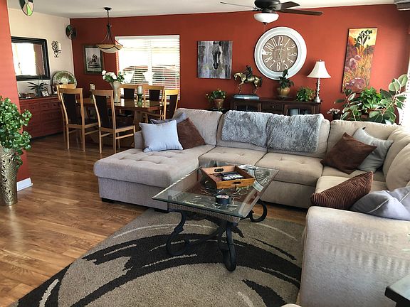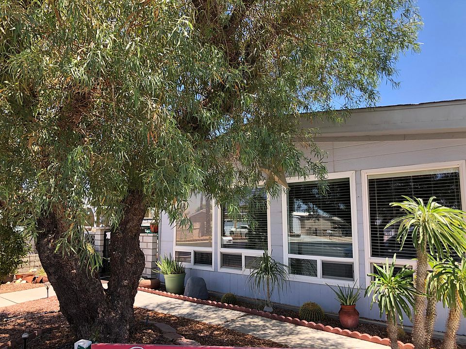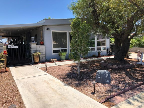 Beautiful 56'foot in length and over 24ft wide manufactured home. Completely updated with wood laminate floors throughout and tile floors in both bathrooms. This could be a great retirement home or second home with all year round golf included in a low HOA with gated and 24 hour guarded security. Many upgrades included in the kitchen appliances along with window coverings. You have the privacy in the backyard with your own jacuzzi coming off the master bedroom. The master bath is a walk in open shower. The second bath is complete. Separate dinning room and living rom off the kitchen. One large carport with 2 parking capabilities and also another covered patio on the other side with privacy. This home has been well taken care of and is in pristine shape. Ready to move in! Some furnishings can be purchased outside of escrow.