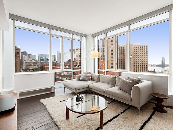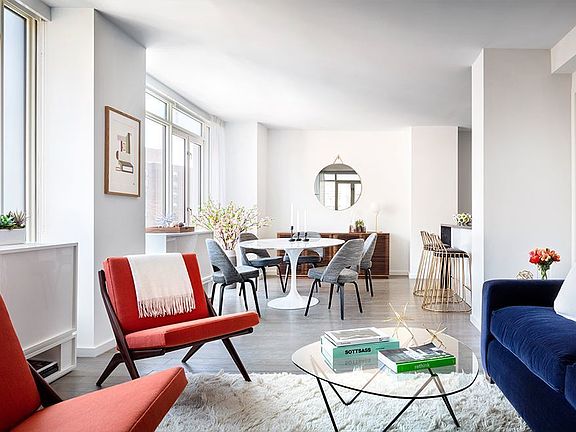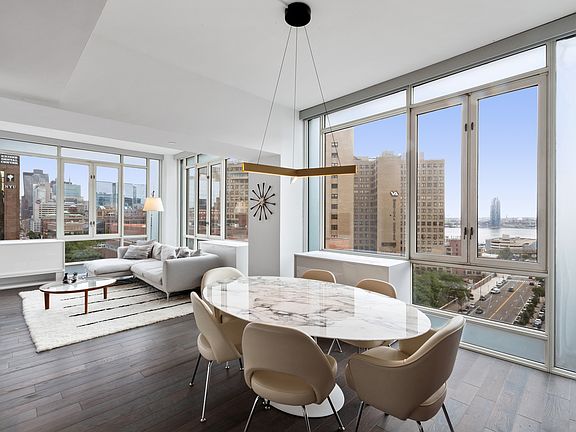 Sun-drenched triple mint split two bedroom condominium with River and Empire State building views! 14E is the only available apartment in the coveted E line at CODA, 385 First Avenue. The fourteenth floor also offers the highest ceilings in the building, with ceiling heights of almost 10 feet. A graciously proportioned entrance hall leads to a chef's kitchen and open great room. The chef's kitchen boasts top-of-the-line appliances from Bosch and Sub-Zero, honed Petite Granite countertops and backsplash, an oversize built-in breakfast bar, custom pendant lighting, and imported high-gloss white lacquer cabinetry. The graciously proportioned corner great room spans 28 feet, with walls of floor-to-ceiling windows offering city and river views. A beamed ceiling creates the sense of discreet spaces for living and dining. The master suite enjoys Empire State building views, with two oversize closets and a luxuriously appointed en-suite bathroom, featuring a Bardiglio marble double vanity, Bardiglio marble flooring, polished Olympic marble walls, and fixtures by Toto and Waterworks.The secondary bedroom features river views and a double closet with an additional storage space above. The second full bath boasts Waterworks and Toto fixtures, a marble vanity, and custom tilework. Additional features include 5 inch wide oak flooring, Lutron recessed lighting in each room, custom electronic window shades, and a GE washer with vented dryer. Amenities and services include a 24-hour attended lobby, live-in Resident Manager, private fitness room programmed by The Wright Fit, resident's lounge and landscaped terrace with grill, fully furnished and landscaped roof deck, and private storage.