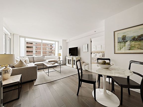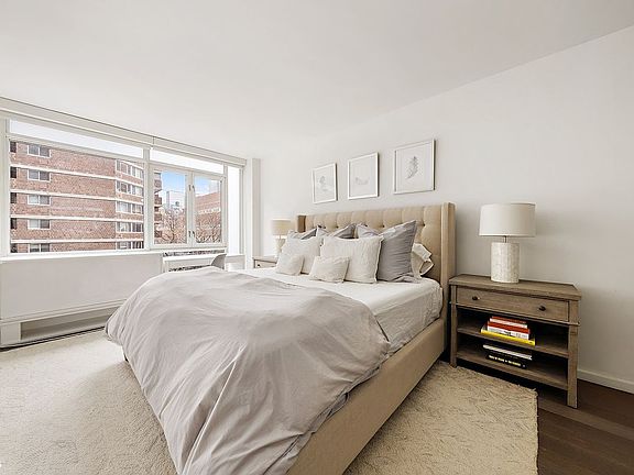 This meticulously maintained home features a perfect layout with two bedrooms and two bathrooms, and offers 1,190 square feet of glorious space. This sun filled apartment has north and west exposures. The primary bedroom suite boasts an enormous closet, while the primary bathroom includes Bardiglio marble flooring, gloss lacquer vanity with honed Bardiglio marble countertop, polished Olympic marble walls and Waterworks fixtures. The full sized secondary bedroom offers versatility as it can be used as a bedroom or work space. Kitchen features include Petite Granite countertops and backsplash, custom glossy white lacquer cabinetry, Sub Zero refrigerator, Bosch cooktop, oven, and dishwasher. Additional features offer 5 wide oak flooring, a washer and vented dryer, and through wall HVAC units in white lacquer custom cabinetry.