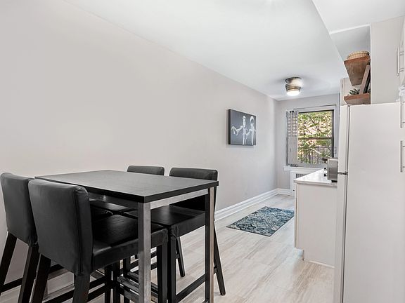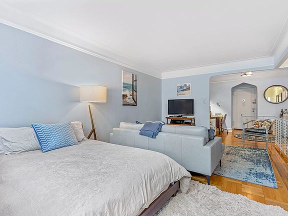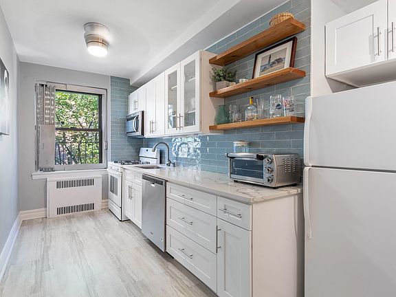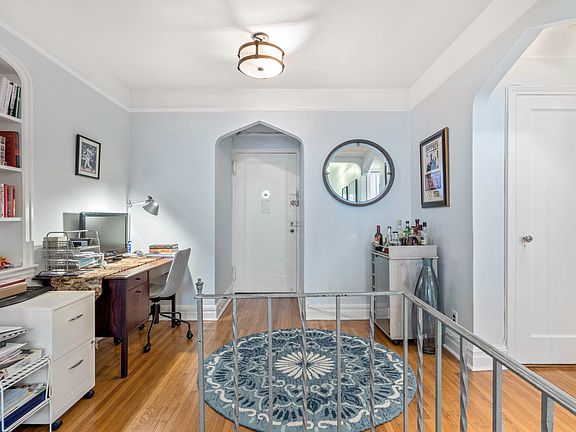 Massive studio apartment in the heart of Ditmas Park! This top floor studio apartment is located in a beautiful pre-war building just steps from the shops and restaurants on Cortelyou Rd and 3 short blocks from the subway. The first things you notice when stepping into this apartment are the pre-war details and the spaciousness of a studio that feels larger than many 1 bedroom apartments. After passing through the foyer, to the right is a work from home space with built-in bookshelves. To the left there is room for a bar cart or even another small desk. The living area and sleeping area beyond are both ample and well defined by the layout. A hallway separates the bathroom from the bedroom, living space, and kitchen. Very tastefully renovated with a new stone countertop, tiled backsplash, new cabinetry and flooring, the windowed kitchen has plenty of room for a dining table for 4. There is plenty of countertop space and cabinets as well as a full-sized dishwasher. The apartment has 3 very large closets (2 walk-ins!), an unusually large amount of storage space for a studio. With an arched entryway, baseboard and ceiling moldings, original hardwood floors, and a built-in bookcase, the apartment retains plenty of pre-war charm. Located on the top floor, the apartment gets plenty of light from the east, and the light color tones within the apartment add to the airy feeling throughout. The eastern-facing windows look out on leafy trees and bright sun. Located on the top floor and the backside of the building, the apartment is pin-drop quiet. This apartment is in exceptional condition, recently renovated, and move-in ready.