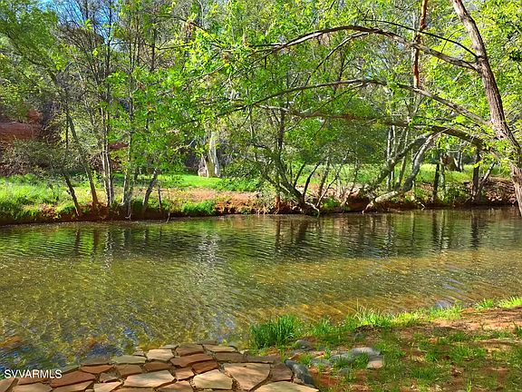 Creekside estate with red rock views in an upscale private gated subdivision surrounded by National Forest and the free flowing waters of Oak Creek. Ideal shady getaway with an open path down to the creek and a swimming hole directly behind the home. Single level home perfect for entertaining with oversized chef's kitchen with marble countertops, knotty alder cabinetry, stainess Thermador appliances and butler's pantry. Three separate bedroom suites each with access to patios and decks for separation and privacy. Massive primary bedroom suite features multiple closets and a spa-like escape of a bathroom. Rear covered patio increases the livable square footage and walks out to both the backyard pool and creek with neighborhood access trail system winding along the banks of Oak Creek.