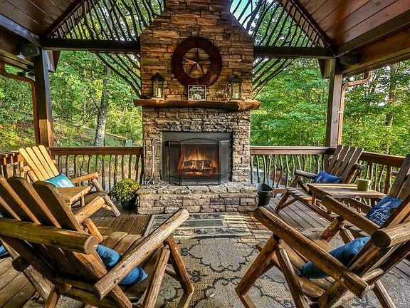 - Exterior: Porch, Private Location, Deck, Hot Tub, Wrap Around Deck, Exterior Fireplace, Firepit Area