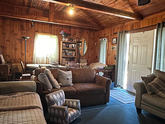 The northern unit consists of three bedrooms, two baths, fireplace, and off-street parking for three vehicles. The living room walls and ceiling are wood paneled.