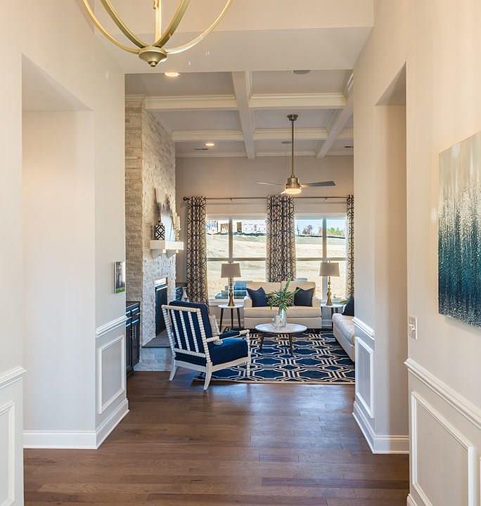 Winchester M (Under Construction) Welcome to this stunning 4-side brick home with a 2-car side entry garage featuring a 4-foot extension for additional storage. With an oversized lot that backs up to a tree line, this home is perfect for those seeking privacy and tranquility. The gourmet kitchen boasts energy-star smart appliances and stunning quartz countertops, making this the perfect space for any aspiring chef. The formal foyer and dining room provide an elegant touch to the home, while the family room has a raised coffered ceiling and a beautiful stone gas log fireplace. Split-level ranch with 3 rooms down, including the owner suite with a private bath, a tiled shower with a seat, and a luxurious garden tub. Enjoy bonus w/4th & 5h bed & bath on the second floor.