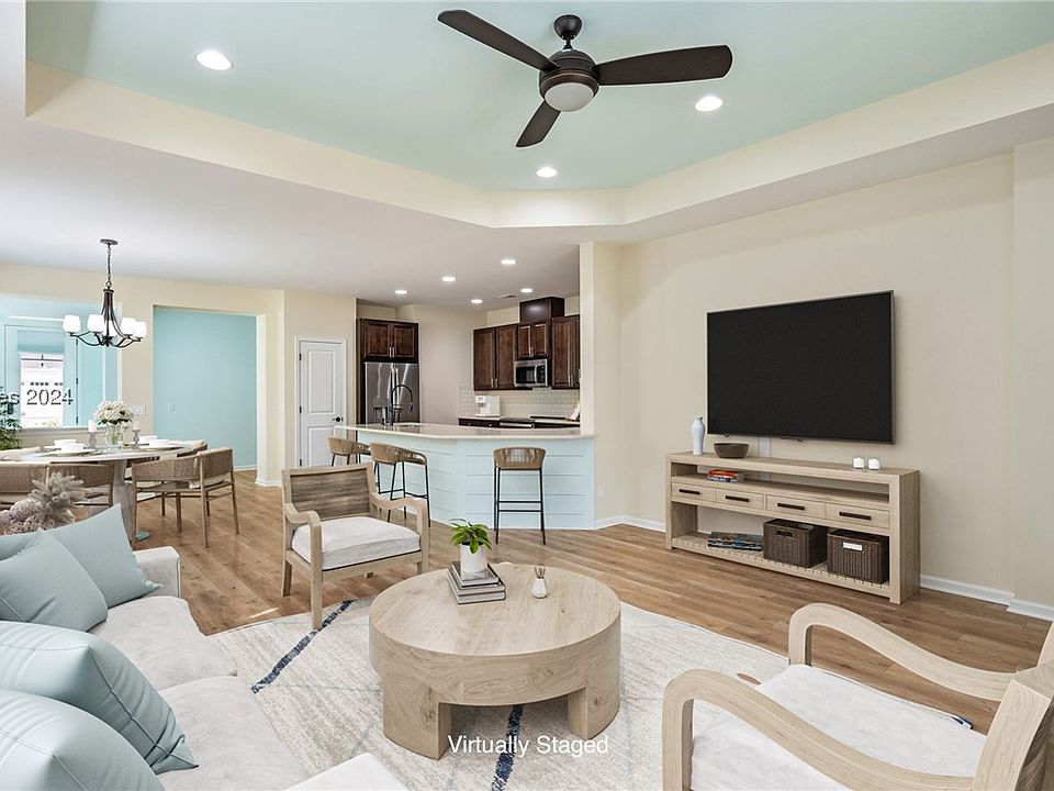No need to wait to have your “cheeseburger in Paradise” while building a Barbuda villa! You can move in now - this home is immaculate with many upgrades and a large screened lanai. Start having fun and enjoying the awesome lifestyle. Quartz countertops, rich wooden cabinetry, stainless steel appliances, hardwoods throughout, shiplap in great room. Nice laundry with cabinetry. Epoxy garage floor. Quiet established cul-de-sac street close to Town Square. Don’t wait!