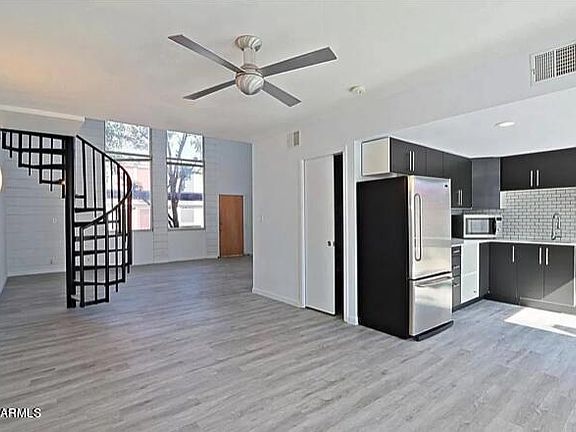Contemporary re-designed loft/townhome in Uptown Phoenix's coveted Pierson West Historic District. Enter the spacious living/family room to soaring ceilings, windows and natural light. Beautiful and functional kitchen with newer appliances, fixtures, and stylish tile backsplash. Living/family room, kitchen, full bath, and bonus room downstairs. Upstairs has primary bedroom, 2nd full bath, laundry, extended hall closets, and large back deck. Wood-look vinyl plank tile throughout. Enjoy sunshine, BBQs or gardening on back patio or swim at community pool. Walk to Melrose District, light-rail, local bars & restaurants. Minutes to Footprint Center, Ballpark, Orpheum, Convention Center & more.